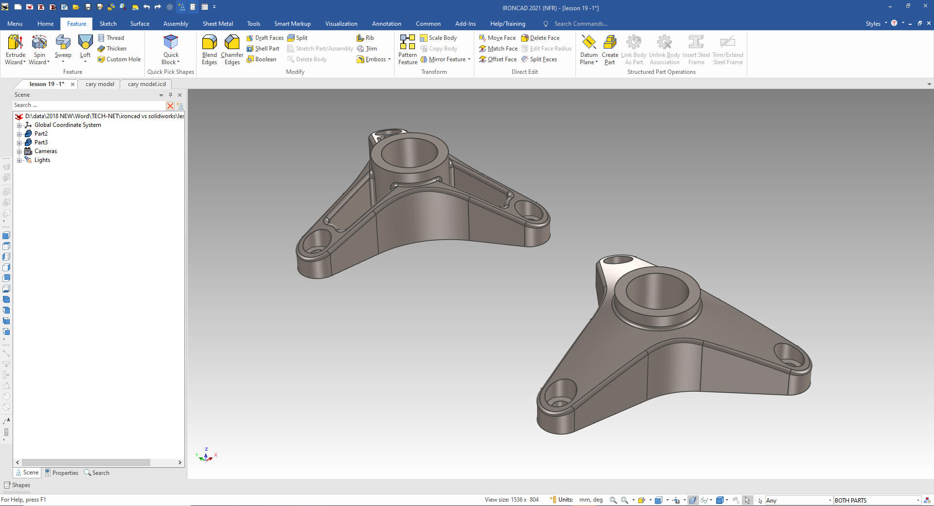 drop design paradigm. I saw the following video challenges on linkedin and thought I would give it a try on IronCAD. I actually did it before I watched the video, so I did it a bit differently. This will give you an idea how different and flexible IronCAD is compared to the conventional Pro/e clone and to the not so conventional Fusion 360. To see these same lessons in ZW3D: ZW3D vs Solidworks These following exercises started out to show the benefits of IronCAD over Solidworks, but quickly turned into a study of modeling techniques. Take a look at all of them they will open your eyes to a much different and more productive way of modeling. It really has more to do with modeling technique than it has to do with the 3D CAD systems. I have found that I do 3D modeling as compared to the conventional 2D sketching. IRONCAD vs Solidworks Lesson One ![]() IRONCAD vs Solidworks Lesson Two ![]() IRONCAD vs Solidworks Lesson Three ![]() IRONCAD vs Solidworks Lesson Four ![]() IRONCAD vs Solidworks Lesson Five ![]() IRONCAD vs Solidworks Lesson Six ![]() IRONCAD vs Solidworks Lesson Seven ![]() IRONCAD vs Solidworks Lesson Eight ![]() IronCAD vs Solidworks Lesson Nine ![]() IronCAD vs Solidworks Lesson Ten ![]() IRONCAD vs Solidworks Lesson Eleven ![]() IronCAD vs Solidworks Lesson Twelve ![]() IronCAD vs Solidworks Thirteen ![]() IronCAD vs Solidworks Lesson Fourteen ![]() IronCAD vs Solidworks Lesson Fifteen ![]() IronCAD vs Solidworks Lesson Sixteen ![]() IronCAD vs Solidworks Lesson Seventeen ![]() IronCAD vs Solidworks Lesson Eighteen IIronCAD vs Solidworks Lesson Nineteen IIf you would like to try IronCAD, please download for a 30 day evaluation. Give me a call if you have any questions. I can set up a skype or go to meeting to show this part or answer any of your questions on the operation of IronCAD. It truly is the very best conceptual 3D CAD system.